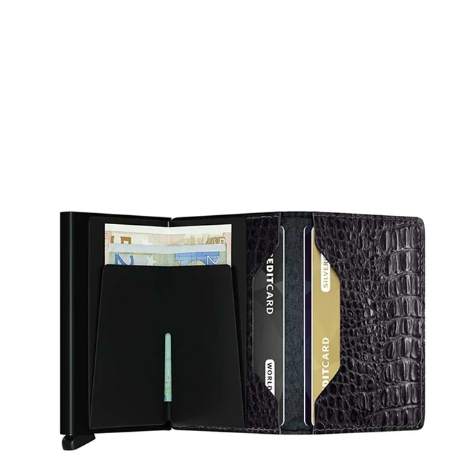 Dankzij het ruimer gesneden leer is er plaats voor meer kaarten, briefgeld, visitekaartjes en bonnetjes. De basis van de Slimwallet is de Secrid Cardprotector en biedt ruimte aan zes kaarten. Dankzij het unieke ontwerp schuiven de kaarten trapsgewijs naar buiten voor een eenvoudige selectie. Belangrijkste passen zijn optimaal beschermd, zowel tegen buigen en breken als tegen ongewenst uitlezen van RFID-kaarten.